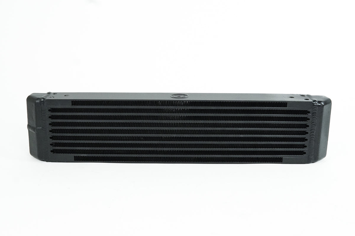 This Dual-Pass Oil Cooler can be mounted horizontally, vertically, as well as parallel to the ground (provided that the oil cooler has proper air-flow). The CSF #8201 Oil Cooler has custom end tanks with a 45' front angle, allowing it to fit flush inside '73-style RS bumpers. The fittings are pointed straight back. For best airflow and highest performance, CSF recommends cutting the front tub to allow for proper air flow, exiting behind the oil cooler and underneath the vehicle. Cutting the front tub will also give clearance to allow adding a rear fan shroud to pull more air through the cooler at slower speeds or while idling. In universal applications these oil coolers are commonly utilized for engine oil, transmission oil, power-steering fluid, and differential fluid, plus can be used as a water heat exchanger.The unique design of CSF's oil cooler line has distinct advantages over conventional style oil coolers (plate-type/stacked oil coolers). The oil coolers can be placed in tighter spaces or different areas of the vehicle that don't have much vertical surface area. Longer rectangular sizes can also help with avoiding the stacking of too many coolers which may cause airflow issues to other components in the cooling system. Inlet/outlet port placement is much easier to route oil lines. Typical oil cooler lines have to be routed from different/opposite ends of the cooler often facing up or down. Usually one line has to run across from one side of the cooler to the other to then be routed together to the feed/return connection of the oil system. The CSF oil coolers are much more robust, durable, and can withstand a higher peak burst rate. This allows the cooler to be mounted in areas that might get high debris (front fascia, diff cooler, side vents, etc?). The CSF oil cooler is designed to withstand a tremendous amount of vibration and debris.