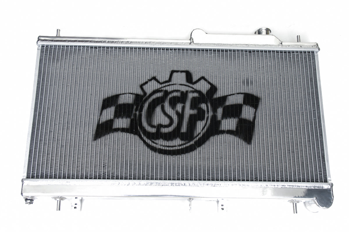 CSF has over 5 decades of experience manufacturing radiators. So when it comes to keeping your engine cool and your WRX/STI running at its best, a CSF High-Performance All-Aluminum Radiator is the obvious choice. Designed to perform on the street or at the track, a performance radiator is a must-have for both high horsepower builds as well as race vehicles which need added cooling performance in motorsports environments. This radiator features a 2-Row core with CSF's exclusive B-Tube Technology: Unlike a regular oval shape "O" type radiator tube, CSF uses a specially engineered tube in the shape of a "B". These "B-tubes" are carefully formed and then brazed over the seam to seal. CSF is able to use thinner and lighter aluminum material (with better cooling efficiency) because this design is actually stronger than normal "O" shape tubes that are welded. The design (inlet in the middle of the tube that is seam brazed) increases the heat transfer surface area of the tubes by approximately 15% over regular tubes - producing the efficiency of two smaller tubes vs. one large tube within the same space criteria. With "B-tubes" you are able to get "dual liquid laminar flow". CSF also uses ultra efficient multi louvered fins that are carefully and precisely aligned to maximize airflow through each radiator core. Fin specifications are carefully measured and calculated for each application, and tested for maximum heat rejection efficiency in our wind-tunnel lab.The CSF WRX/STI radiator is a true "Drop-in fit" design requiring no modifications to install. OE style brackets are all CNC machined and welded for the best durability possible. Inlet/Outlet connections are designed to match the OE connections so you can reuse OEM hoses or aftermarket. Trust the cooling experts at CSF for the best performing, highest-quality, and most reliable radiators.