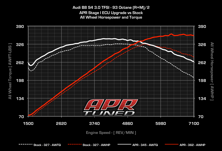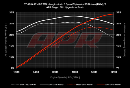 Please note: All power figures are produced from APR, LLC marketing materials. Depending on your vehicle condition, fuel (AKI), & environmental factors the results may vary.