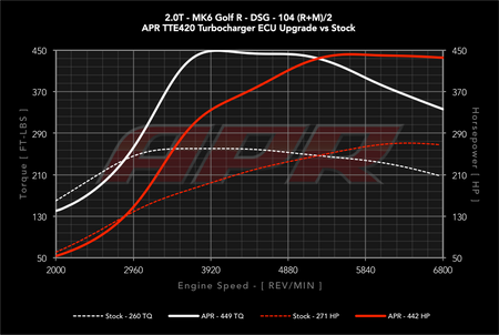 | - Reported wheel figures measured using APR's in-house Dynapack Dynamometer with a US Spec MK6 Golf R in FWD mode with TTE420 turbocharger, APR Cast Downpipe, APR Intake System and APR Intercooler, using SAEJ1349 correction and an average of multiple runs. Crank figures are estimated based on the measured wheel figures. Results may vary depending upon environmental conditions, vehicle, transmission, vehicle health, operating conditions, temperatures, fuel grade, dyno type, dyno setup, other variables and other modifications. | ||||||