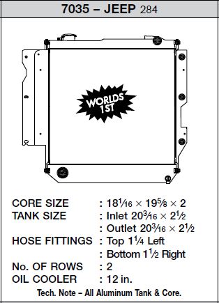 📞 Ask an Expert!CSF has over 5 decades of experience manufacturing radiators. So when it comes to keeping your engine cool and your Wrangler running at its best, a CSF Heavy-Duty/High-Performance All-Aluminum Radiator is the obvious choice. Designed to perform on and off road, a heavy-duty performance radiator is a must-have for off-roaders, overlanders, and adventurers. This radiator features a 2-Row core with CSF's exclusive B-Tube Technology: Unlike a regular oval shape "O" type radiator tube, CSF uses a specially engineered tube in the shape of a "B". These "B-tubes" are carefully formed and then brazed over the seam to seal. CSF is able to use thinner and lighter aluminum material (with better cooling efficiency) because this design is actually stronger than normal "O" shape tubes that are welded. The design (inlet in the middle of the tube that is seam brazed) increases the heat transfer surface area of the tubes by approximately 15% over regular tubes - producing the efficiency of two smaller tubes vs. one large tube within the same space criteria. With "B-tubes" you are able to get "dual liquid laminar flow". CSF also uses ultra efficient multi louvered fins that are carefully and precisely aligned to maximize airflow through each radiator core. Fin specifications are carefully measured and calculated for each application, and tested for maximum heat rejection efficiency in our wind-tunnel lab.The CSF Wrangler radiator is a true "Drop-in fit" design requiring no modifications to install. OE style brackets are all CNC machined and welded for the best durability possible. Inlet/Outlet connections are designed to match the OE connections so you can reuse OEM hoses or aftermarket. Whether you are off-roading, towing, or just casually driving, trust the cooling experts at CSF for the best performing, highest-quality, and most reliable radiators.