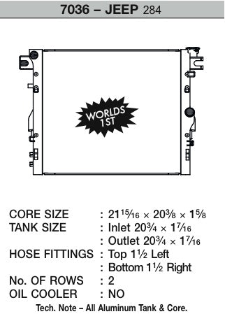CSF has over 5 decades of experience manufacturing radiators. So when it comes to keeping your engine cool and your Wrangler running at its best, a CSF Heavy-Duty/High-Performance All-Aluminum Radiator is the obvious choice. Designed to perform on and off road, a heavy-duty performance radiator is a must-have for off-roaders, overlanders, and adventurers. This radiator features a 2-Row core with CSF's exclusive B-Tube Technology: Unlike a regular oval shape "O" type radiator tube, CSF uses a specially engineered tube in the shape of a "B". These "B-tubes" are carefully formed and then brazed over the seam to seal. CSF is able to use thinner and lighter aluminum material (with better cooling efficiency) because this design is actually stronger than normal "O" shape tubes that are welded. The design (inlet in the middle of the tube that is seam brazed) increases the heat transfer surface area of the tubes by approximately 15% over regular tubes - producing the efficiency of two smaller tubes vs. one large tube within the same space criteria. With "B-tubes" you are able to get "dual liquid laminar flow". CSF also uses ultra efficient multi louvered fins that are carefully and precisely aligned to maximize airflow through each radiator core. Fin specifications are carefully measured and calculated for each application, and tested for maximum heat rejection efficiency in our wind-tunnel lab.The CSF Wrangler radiator is a true "Drop-in fit" design requiring no modifications to install. OE style brackets are all CNC machined and welded for the best durability possible. Inlet/Outlet connections are designed to match the OE connections so you can reuse OEM hoses or aftermarket. Whether you are off-roading, towing, or just casually driving, trust the cooling experts at CSF for the best performing, highest-quality, and most reliable radiators.