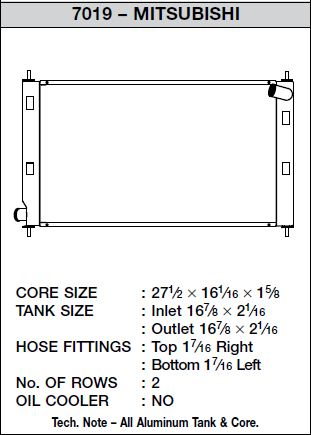 CSF has over 5 decades of experience manufacturing radiators. So when it comes to keeping your engine cool and your Evo X running at its best, a CSF High-Performance All-Aluminum Radiator is the obvious choice. Designed to perform on the street or at the track, a performance radiator is a must-have for both high horsepower builds as well as race vehicles which need added cooling performance in motorsports environments. This radiator features a 2-Row core with CSF's exclusive B-Tube Technology: Unlike a regular oval shape "O" type radiator tube, CSF uses a specially engineered tube in the shape of a "B". These "B-tubes" are carefully formed and then brazed over the seam to seal. CSF is able to use thinner and lighter aluminum material (with better cooling efficiency) because this design is actually stronger than normal "O" shape tubes that are welded. The design (inlet in the middle of the tube that is seam brazed) increases the heat transfer surface area of the tubes by approximately 15% over regular tubes - producing the efficiency of two smaller tubes vs. one large tube within the same space criteria. With "B-tubes" you are able to get "dual liquid laminar flow". CSF also uses ultra efficient multi louvered fins that are carefully and precisely aligned to maximize airflow through each radiator core. Fin specifications are carefully measured and calculated for each application, and tested for maximum heat rejection efficiency in our wind-tunnel lab.The CSF Evo X radiator is a true "Drop-in fit" design requiring no modifications to install. OE style brackets are all CNC machined and welded for the best durability possible. Inlet/Outlet connections are designed to match the OE connections so you can reuse OEM hoses or aftermarket. Trust the cooling experts at CSF for the best performing, highest-quality, and most reliable radiators.