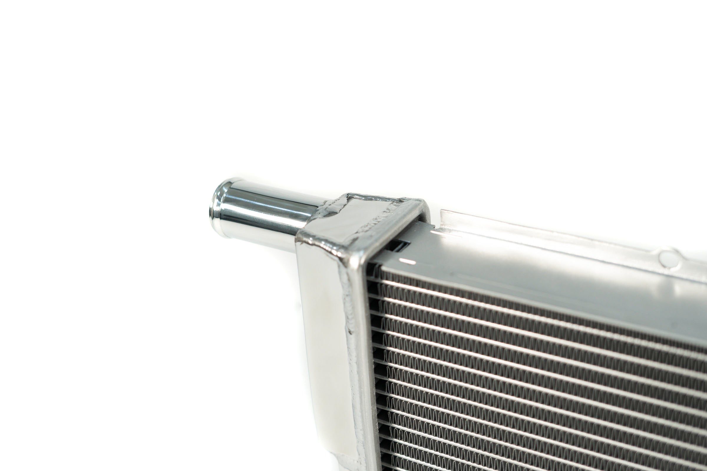 CSF has over 5 decades of experience manufacturing radiators. So when it comes to keeping your engine cool and your 911 Turbo running at its best, a CSF High-Performance All-Aluminum Radiator is the obvious choice. Designed to perform on the street or at the track, a performance radiator is a must-have for both high horsepower builds as well as race vehicles which need added cooling performance in motorsports environments. This radiator features a 2-Row core with CSF's exclusive B-Tube Technology: Unlike a regular oval shape "O" type radiator tube, CSF uses a specially engineered tube in the shape of a "B". These "B-tubes" are carefully formed and then brazed over the seam to seal. CSF is able to use thinner and lighter aluminum material (with better cooling efficiency) because this design is actually stronger than normal "O" shape tubes that are welded. The design (inlet in the middle of the tube that is seam brazed) increases the heat transfer surface area of the tubes by approximately 15% over regular tubes - producing the efficiency of two smaller tubes vs. one large tube within the same space criteria. With "B-tubes" you are able to get "dual liquid laminar flow". CSF also uses ultra efficient multi louvered fins that are carefully and precisely aligned to maximize airflow through each radiator core. Fin specifications are carefully measured and calculated for each application, and tested for maximum heat rejection efficiency in our wind-tunnel lab.The CSF 911 Turbo radiator is a true "Drop-in fit" design requiring no modifications to install. OE style brackets are all CNC machined and welded for the best durability possible. Inlet/Outlet connections are designed to match the OE connections so you can reuse OEM hoses or aftermarket. Trust the cooling experts at CSF for the best performing, highest-quality, and most reliable radiators.