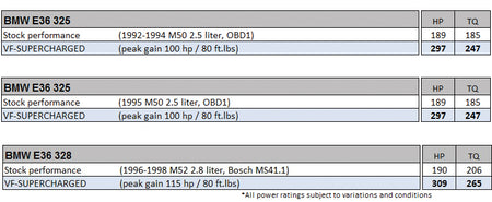 VF-Engineering chose to supercharge the BMW 3 series (non-M) model years 1992 to 1998 to improve throttle response and mid-to-top end power with the centrifugal Vortech supercharger. Maintaining the the original BMW quality, smoothness and reliability were the key factors in the VF design. This is where the VF Hex Flash software comes into full effect. VF has harnessed reliability of Vortech superchargers and quality of VF custom software with over 19 years of supercharging experience and worldwide OEM supply sources to create the ultimate supercharger system for the ultimate driver’s car.