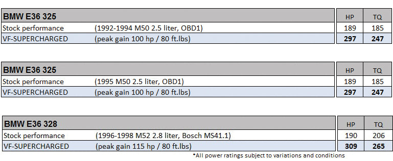 VF-Engineering chose to supercharge the BMW 3 series (non-M) model years 1992 to 1998 to improve throttle response and mid-to-top end power with the centrifugal Vortech supercharger. Maintaining the the original BMW quality, smoothness and reliability were the key factors in the VF design. This is where the VF Hex Flash software comes into full effect. VF has harnessed reliability of Vortech superchargers and quality of VF custom software with over 19 years of supercharging experience and worldwide OEM supply sources to create the ultimate supercharger system for the ultimate driver’s car.