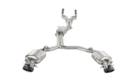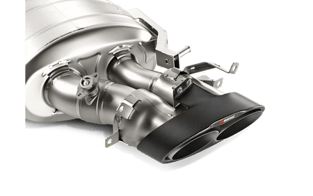 Audi’s high-performance RS models are an ideal match for the expertly styled and beautifully engineered Akrapovič Evolution exhaust systems. The Evolution gives more power, higher torque, decreases the weight, and delivers an unmistakable Akrapovič sound—which has a deep sound at lower revs and a ‘popping’ sound as things speed up when the throttle is lifted. This titanium exhaust system has cast collectors and three mufflers, with the central one featuring an x-piece inside, which increase power and improve its sound. The valves of the system are designed to open and close in line with the RS’ standard electronics, and the whole system has carbon-fibre tailpipes to show off the exquisite finish of the Akrapovič exhaust. Its easy-to-fit instructions are included, and with this cat-back performance exhaust system—which means that the stock catalytic converters remain in place—there’s no need to remap the ECU (it’s simply a plug-and play system).