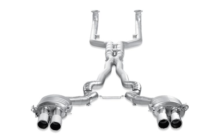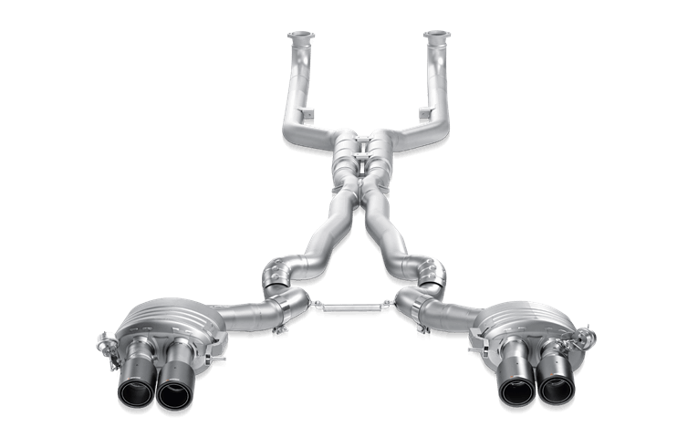 After adding a full titanium Evolution system, you’ll never want to stop driving. The exhaust system is made of our proprietary titanium and consists of dual-outlet mufflers with exhaust valves, flow-optimized pipes, and a unique cast X-shaped part with resonators. The Evolution lowers the back pressure and gives the M5 more power without removing the catalytic converters. It increases responsiveness and offers a big difference in weight. Sound is improved too, with a deep sporty sound that grows to an aggressive roar when driven hard but still has no droning. It works well with the M5’s ANC system - just like the valve system, which is regulated through the M5’s settings. Complete the look with a set of four exquisite tailpipes in titanium or carbon fibre.