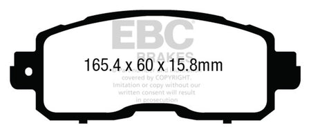 Designed for premium street driving offering better brake effect up to 600-degrees C (1100-degrees F). EBC Greenstuff has a high initial brake effect and gives drivers confidence from first application of the brake pedal. There is no such thing as a NO DUST pad. The very nature of how a brake works requires that some dust be generated to avoid rotor vibration (shimmying). The EBC pad creates less dust and dust is more easily washed off than most. All pads create more dust as they are bedding in especially if rotors are worn. Nominal friction coefficient 0.55. For heavier faster cars and vehicles above 200bhp we strongly recommend Redstuff which DOES offer much less dust.