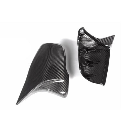 MHC+ BMW M Style Wing Mirror Covers In Gloss Pre Preg Carbon Fibre add an 'M' look to your non-M vehicle. The angular fins add aggression to your vehicle and increase road presence, working especially well when combined with other MHC carbon fibre parts.