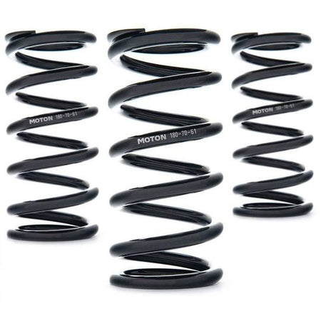 Our MOTON suspension racing springs come in all common sizes and rates. They are made out of extreme high tensile chrome silicon wire and are coiled by a Wafios compression coiling machine. This combination ensures that every spring is made with care and perfection. MOTON suspension racing springs are pre-blocked and are protected for corrosion according OEM specifications. Plus, these springs come backed by a lifetime warranty against breaking, ensuring your peace of mind as you hit the road. Our article numbers consist of 3 digits. The first digit represents the length of the spring in millimeters. The second digit indicates the weight in Newton per MM, and the third digit represents the inner diameter in millimeters. These springs do not fit OEM top mounts. Inches = Millimeters/25.4.