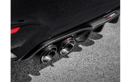 Beautifully crafted hand-laid high-quality carbon fibre diffusers are perfectly styled to enrich the Akrapovič tailpipes and the rear of the car. The sporty and aggressive design adds an extra dimension to the whole package and shows the exhaust system off to its best. Available in high-gloss or matte finish.
