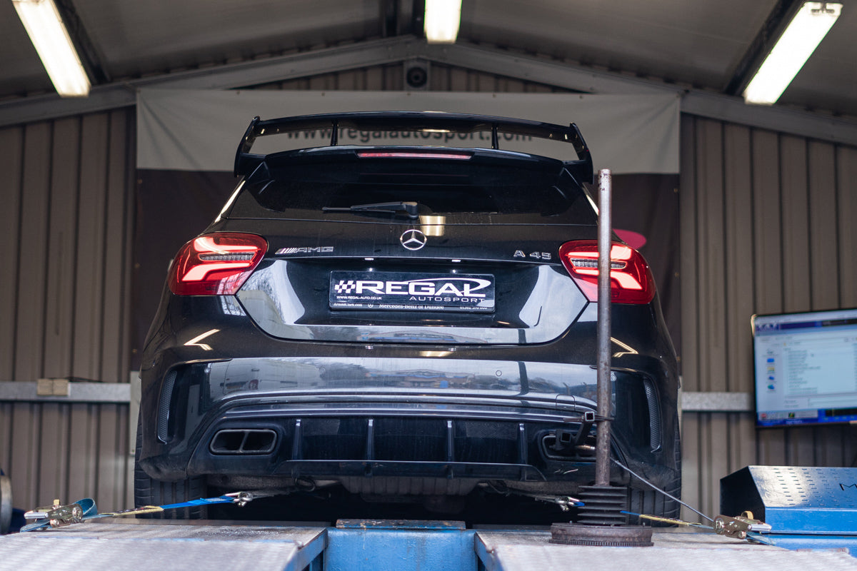 The RSS Stage 1 ECU Remap for the A45 AMG is custom tuned on our in-house Mustang MD-500 AWD Dynometer which is a mechanically linked system and uses TAT dyno software to calculate losses. During the custom tuning session many software maps within the ECU are optimised in order to improve power, torque and drive ability whilst leaving all of the factory safety parameters in place.