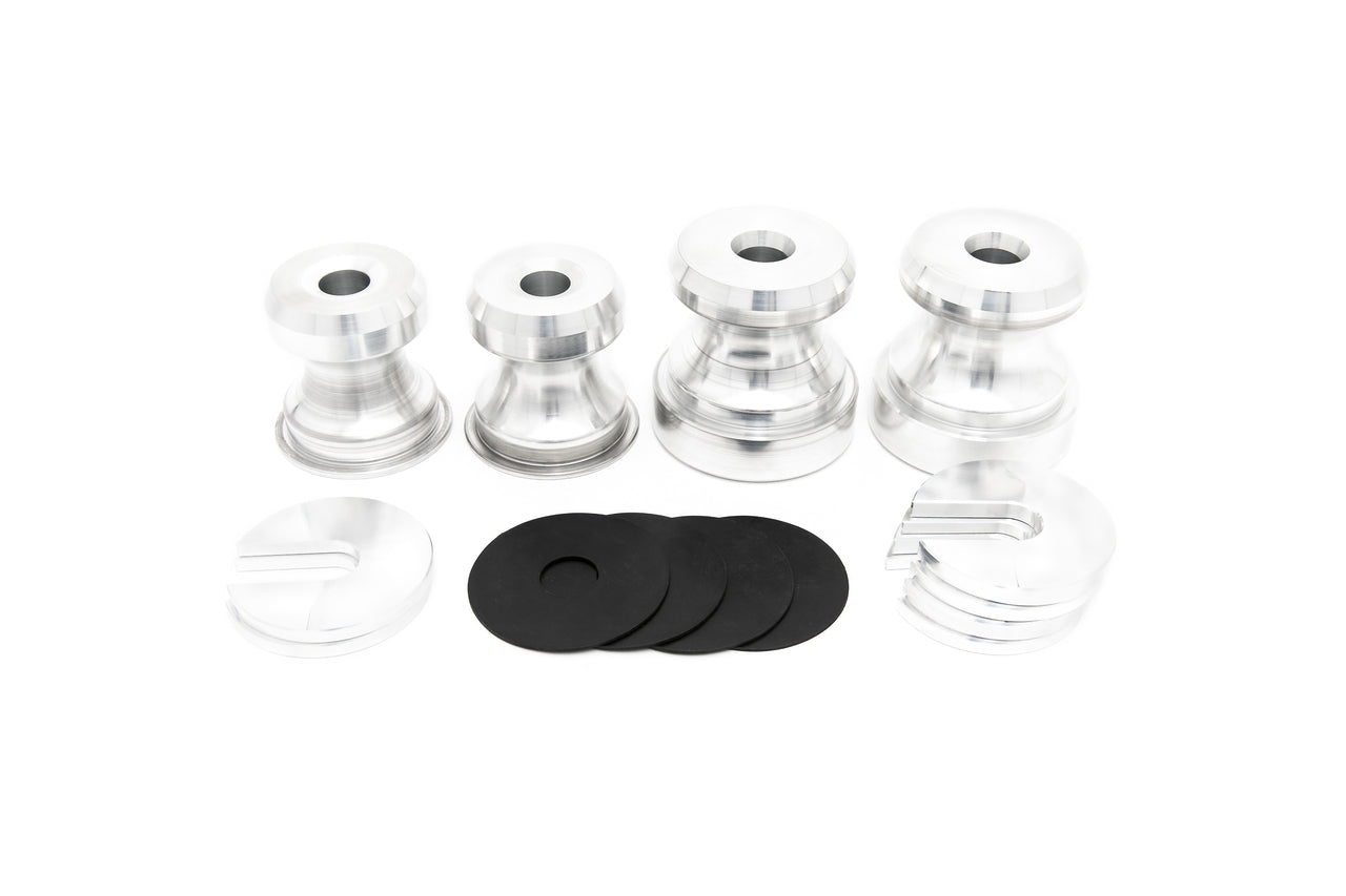 Our slide-in shim system allows you to quickly raise or lower the subframe to fine-tune the roll centre/anti-squat behaviour to your preference. Raising the subframe will compensate roll centre for a lowered car at the expense of increasing anti-squat. Lowering the subframe will decrease anti-squat at the expense of roll centre.