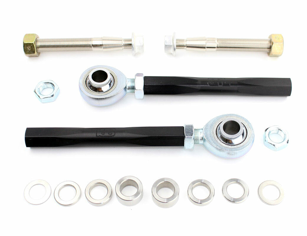 SPL Parts PRO 370z Front Outer Tie Rod Ends (TRE) allow for bumpsteer adjustment by allowing the tie rod end pivot to be relocated with the use of spacers.  Reduced bumpsteer results in smoother steering and quicker lap times.
