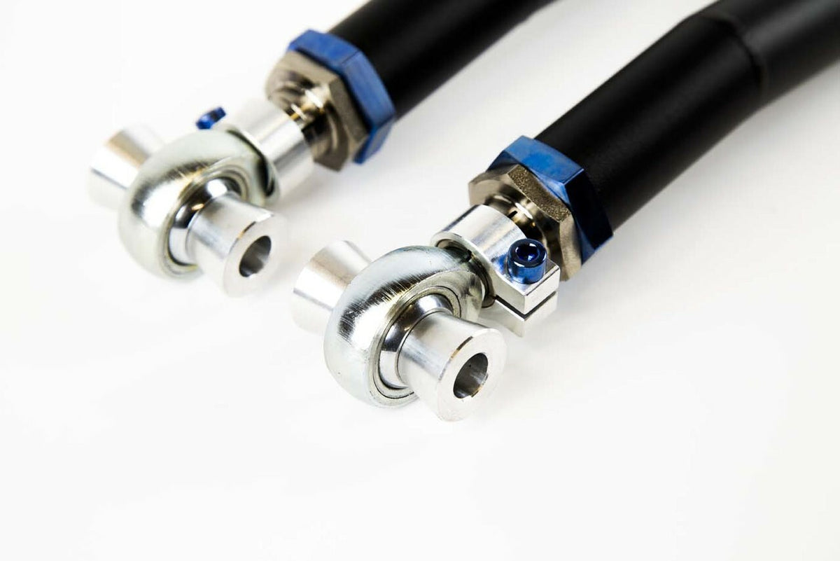 SPL Parts Camber Arms are constructed with 1.25" 4130 Chromoly tubing, slipped over a CNC machined angled steel sleeve, then professionally tig welded.  The angled sleeve prevents the links from hitting the sway bar under suspension travel, while allowing us to use hollow tubing to keep the link incredibly strong yet lightweight.  Our exclusive 4130 Chromoly Double Adjuster offers quick and precise adjustment, and is CNC gun drilled to reduce weight.  Blue Anodized Titanium hardware shaves even more unsprung weight from the arms, without compromising strength.