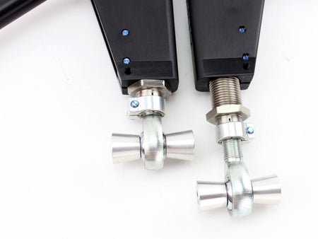 Using 6061-T6 Billet Aluminium hex, we machine and gun drill the Trailing Arms to reduce weight and utilize our Rotating Clamp system to easily lock down caster settings. Blue Anodized Titanium hardware shaves even more unsprung weight from the arms, without compromising strength. Anti dive (when installed in the front) and anti squat (when installed in the rear) adjustment is achieved with Stainless Steel Spacers for the forward mounting position of the trailing/caster arm, allowing you to raise or lower this pivot point and fine tune the balance of your car. Roll centre correction is achieved with Stainless Steel Spacers that work in conjunction with the heat treated 4340 Chromoly Ball Joint Stud, allowing you to lower the ball joint location at the knuckle. Finally, the use of FK Rod Ends and High Misalignment Spherical Bearings eliminates the flex and binding found in the OEM control arms while allowing smooth articulation.