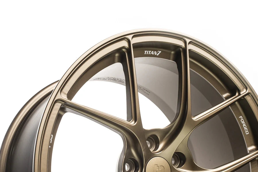 TITAN 7 T-S5 is a fully forged wheel designed completely with performance in mind. Pressurized with 10,000 TONS of industry leading pressure to give you a wheel that is incredibly strong while giving you all of the performance attributes you need in a track focused wheel. Upon close inspection you will notice strength adding ridges which have been strategically placed to give the wheel rigidity while keeping weight to a minimum. The split 5 spoke design was chosen for its motorsports heritage and track worthy structure. Each wheel from Titan 7 features traction improving bead seat knurling, beefed up inner rim flange for durability and strength, and logo machined accents. The T-S5 is designed for each application to clear all popular after market big brake kits while achieving maximum concavity. All wheels are durability tested according to JWL standards to ensure safety while you perform. Authentic performance from Titan 7. Forged for All.