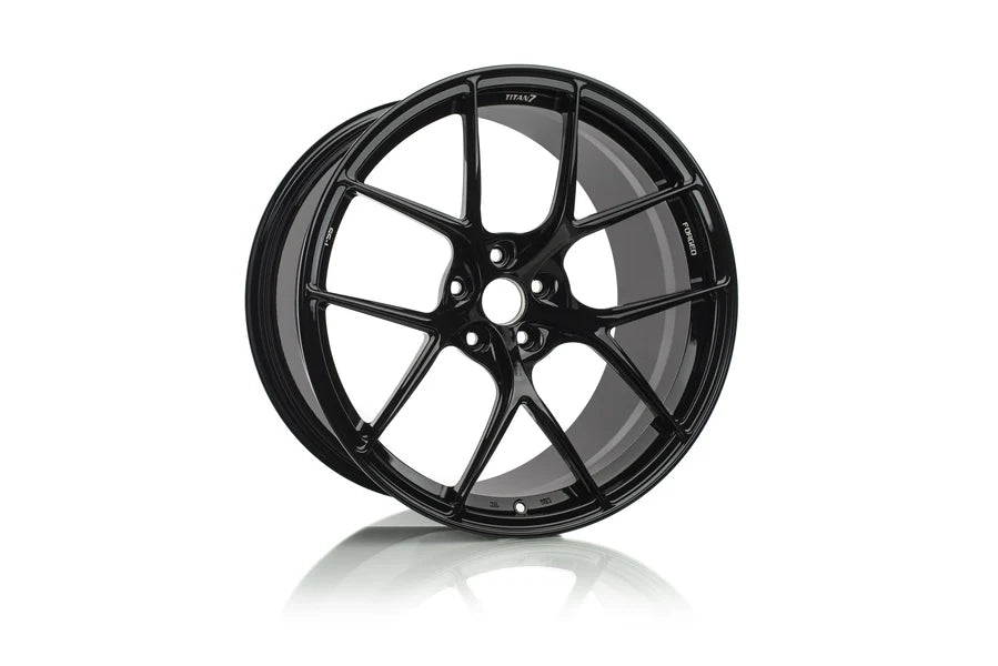 TITAN 7 T-S5 is a fully forged wheel designed completely with performance in mind. Pressurized with 10,000 TONS of industry leading pressure to give you a wheel that is incredibly strong while giving you all of the performance attributes you need in a track focused wheel. Upon close inspection you will notice strength adding ridges which have been strategically placed to give the wheel rigidity while keeping weight to a minimum. The split 5 spoke design was chosen for its motorsports heritage and track worthy structure. Each wheel from Titan 7 features traction improving bead seat knurling, beefed up inner rim flange for durability and strength, and logo machined accents. The T-S5 is designed for each application to clear all popular after market big brake kits while achieving maximum concavity. All wheels are durability tested according to JWL standards to ensure safety while you perform. Authentic performance from Titan 7. Forged for All.