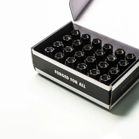 Introducing O.W.L. STEEL RACE NUTS, our "Obsessed with Lightness" product line, crafted from Chromoly 4130 steel, known for its decades of proven strength, endurance, and durability. Featuring specially machined side slots to reduce weight, these race nuts require no special key—just a 17mm hex socket for 12mm thread lugs and a 19mm hex socket for 14mm thread lugs, with a compact 26.5 mm overall length for convenience. Tested beyond OEM standards for repeated installation, removal, torque handling, and retention, they are compatible with speed sockets and feature an open-ended design for extended racing studs. The original Titan 7 patent ensures a unique product, available in a sleek Machine Black finish, "Forged for All" and offering exceptional value. Choose between 35mm short length or 50mm tall length, available in sets of 20 or 24 for 6-lug offroad applications.