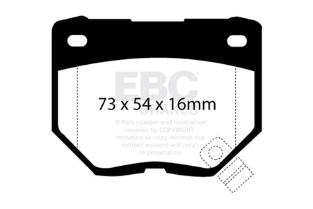 EBC Yellowstuff is an aramid fibre based brake compound with high brake effect form cold and is possibly one of the first ever compounds that can be used for STREET AND TRACK DRIVING. These pads do not require warm up but do get even stronger under the heat of hard driving. These are not a low dust pad and if your desire is for a low dust premium street use pad, you should consider EBC Redstuff.When considering full race use, Yellowstuff has been a strong favourite, having been used for two years in the Swedish Camaro Cup and at numerous other race events where a stock caliper system is fitted.It is also the choice of 90-percent of the Mazda MX5 Miata competitors in the UK race series and has an unblemished record as rotor friendly track pad for vehicles up to 2000 kgs weight or 200 BHP.In the USA the SCCA and NASA drivershave been testing Yellowstuff with feedback and good reports POURING in from a 543 test driver major market proving event with these groups. Read that figure again 543 test drivers.There is no guesswork here.