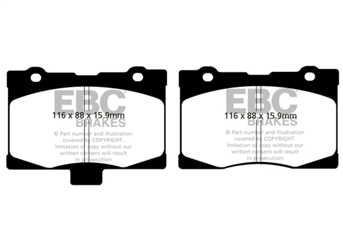 EBC Yellowstuff is an aramid fibre based brake compound with high brake effect form cold and is possibly one of the first ever compounds that can be used for STREET AND TRACK DRIVING. These pads do not require warm up but do get even stronger under the heat of hard driving. These are not a low dust pad and if your desire is for a low dust premium street use pad, you should consider EBC Redstuff.When considering full race use, Yellowstuff has been a strong favourite, having been used for two years in the Swedish Camaro Cup and at numerous other race events where a stock caliper system is fitted.It is also the choice of 90-percent of the Mazda MX5 Miata competitors in the UK race series and has an unblemished record as rotor friendly track pad for vehicles up to 2000 kgs weight or 200 BHP.In the USA the SCCA and NASA drivershave been testing Yellowstuff with feedback and good reports POURING in from a 543 test driver major market proving event with these groups. Read that figure again 543 test drivers.There is no guesswork here.