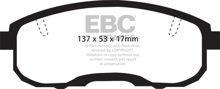 EBC Yellowstuff is an aramid fibre based brake compound with high brake effect form cold and is possibly one of the first ever compounds that can be used for STREET AND TRACK DRIVING. These pads do not require warm up but do get even stronger under the heat of hard driving. These are not a low dust pad and if your desire is for a low dust premium street use pad, you should consider EBC Redstuff.When considering full race use, Yellowstuff has been a strong favourite, having been used for two years in the Swedish Camaro Cup and at numerous other race events where a stock caliper system is fitted.It is also the choice of 90-percent of the Mazda MX5 Miata competitors in the UK race series and has an unblemished record as rotor friendly track pad for vehicles up to 2000 kgs weight or 200 BHP.In the USA the SCCA and NASA drivershave been testing Yellowstuff with feedback and good reports POURING in from a 543 test driver major market proving event with these groups. Read that figure again 543 test drivers.There is no guesswork here.