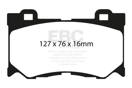 EBC Yellowstuff is an aramid fibre based brake compound with high brake effect form cold and is possibly one of the first ever compounds that can be used for STREET AND TRACK DRIVING. These pads do not require warm up but do get even stronger under the heat of hard driving. These are not a low dust pad and if your desire is for a low dust premium street use pad, you should consider EBC Redstuff.When considering full race use, Yellowstuff has been a strong favourite, having been used for two years in the Swedish Camaro Cup and at numerous other race events where a stock caliper system is fitted.It is also the choice of 90-percent of the Mazda MX5 Miata competitors in the UK race series and has an unblemished record as rotor friendly track pad for vehicles up to 2000 kgs weight or 200 BHP.In the USA the SCCA and NASA drivershave been testing Yellowstuff with feedback and good reports POURING in from a 543 test driver major market proving event with these groups. Read that figure again 543 test drivers.There is no guesswork here.