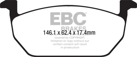 EBC Yellowstuff is an aramid fibre based brake compound with high brake effect form cold and is possibly one of the first ever compounds that can be used for STREET AND TRACK DRIVING. These pads do not require warm up but do get even stronger under the heat of hard driving. These are not a low dust pad and if your desire is for a low dust premium street use pad, you should consider EBC Redstuff.When considering full race use, Yellowstuff has been a strong favourite, having been used for two years in the Swedish Camaro Cup and at numerous other race events where a stock caliper system is fitted.It is also the choice of 90-percent of the Mazda MX5 Miata competitors in the UK race series and has an unblemished record as rotor friendly track pad for vehicles up to 2000 kgs weight or 200 BHP.In the USA the SCCA and NASA drivershave been testing Yellowstuff with feedback and good reports POURING in from a 543 test driver major market proving event with these groups. Read that figure again 543 test drivers.There is no guesswork here.
